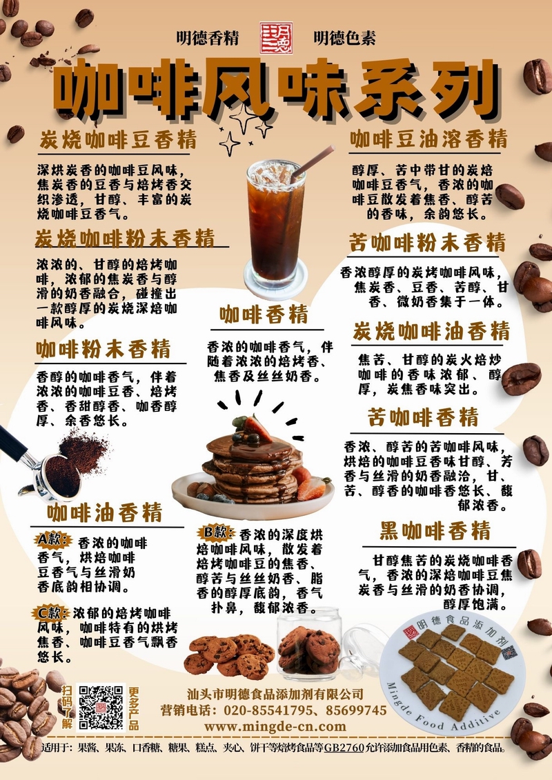 明德咖啡風味系列香精 | 多層咖啡醇香 覆蓋豐富應用場景汕頭市明德食品添加劑有限公司推出的咖啡風味系列香精,涵蓋多種焙炒、奶香、焦糖及深度烘焙調性,滿足飲品、烘焙、糖果、乳制品等多領域的咖啡風味需求,為B端客戶提供穩(wěn)定、真實的咖啡香氣解決方案。